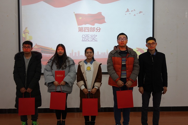 12月20日,粮食与食品工程系学生党支部组织的“学习党的十九大 同心共筑中国梦”党建知识竞赛决赛在报告厅106举行。粮工系党总支副书记冯书祥、辅导员张忠萌、学生党支部组织委员冯诗茗担任评委,由王倩、乐圆主持,参赛选手为通过初赛选拔的中国梦想队、初心依旧队、红旗先锋队、欣欣向荣队、坚定前行队、责任小组队等6只队伍。