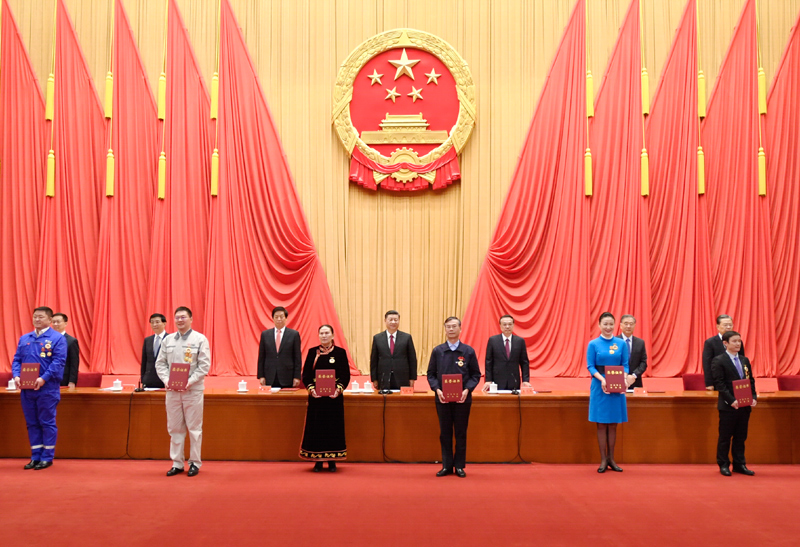 在欢快的乐曲声中,全国劳动模范和先进工作者代表依次登上主席台,习近平等为他们颁发荣誉证书。