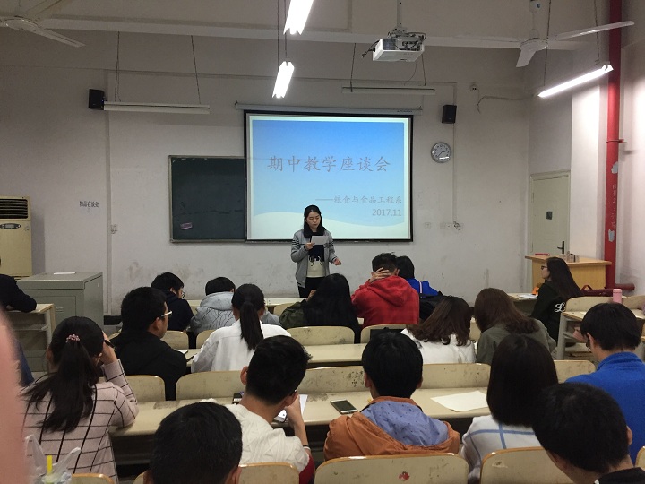 本网讯(通讯员 杨欣悦)2017-2018学年第一学期的学习生活已过半,为了检验教学质量,提高教学效果,进一步推动本系学风建设,粮食与食品工程系于11月8日晚上6点30 分在知新楼104教室召开了期中教学检查学生座谈会。本次座谈会由粮食与食品工程系党总支副书记冯书祥主持,各位任课教师和各班级的学生代表参加。