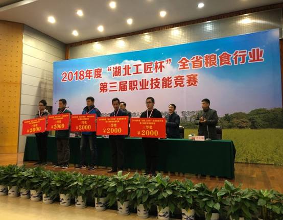 单招班学生由汪浩明、刘爱红等指导教师进行为期两个月的理论和实操集训,组队参加了由湖北省粮食局、湖北省人力资源和社会保障厅、湖北省总工会共同主办,湖北省粮油食品质量监督检测中心和湖北省储备粮油管理公司承办的2018年度“湖北工匠杯”全省粮食行业第三届职业技能竞赛,在比赛中喜获团体优胜奖。黄明作为所在单位的选手参加大赛并在此次竞赛中获个人三等奖。