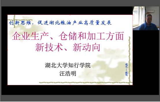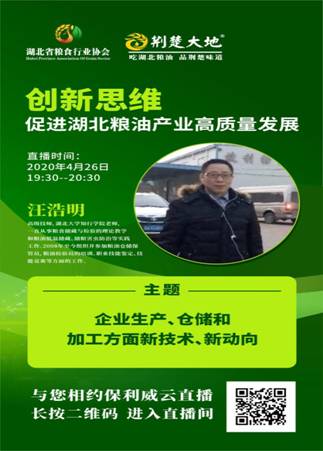 突如其来的疫情使得湖北省工业生产和经济建设受到了较大的影响。如今各行各业复工复产在即,作为关系到国家安全的粮食行业也在紧锣密鼓的准备复工复产相关工作。面对此次疫情,湖北省粮食行业协会充分响应习总书记“复工复产”的号召,在目前仍无法集中开展学习的情况下,针对企业复工复产所关心的焦点问题,组织开展了【战疫.赋能】线上公益直播课堂活动,帮助粮食行业复工复产。我校bat365官方网站汪浩老师受湖北省粮食行业协会邀请,于4月26日19:30分,在直播课堂上作了“粮食仓储与加工的新动向”的专题讲座。
