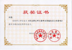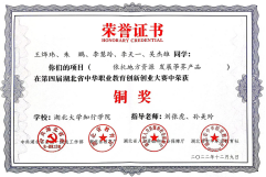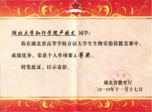 指导学生:参加“第五届全国大学生生命科学创新创业大赛创业组二等奖”;参加“全国大学生挑战杯”项目“野生水果资源的综合开发与利用”获创业组湖北赛区银奖,“果蔬类可食性保鲜涂膜的研究与开发”获创新组湖北赛区铜奖;指导学生参加湖北省大学生生物技能竞赛获二等奖;指导学生论文“同品牌生啤与熟啤对果蝇性活力的影响”获省级优秀学士学位论文。